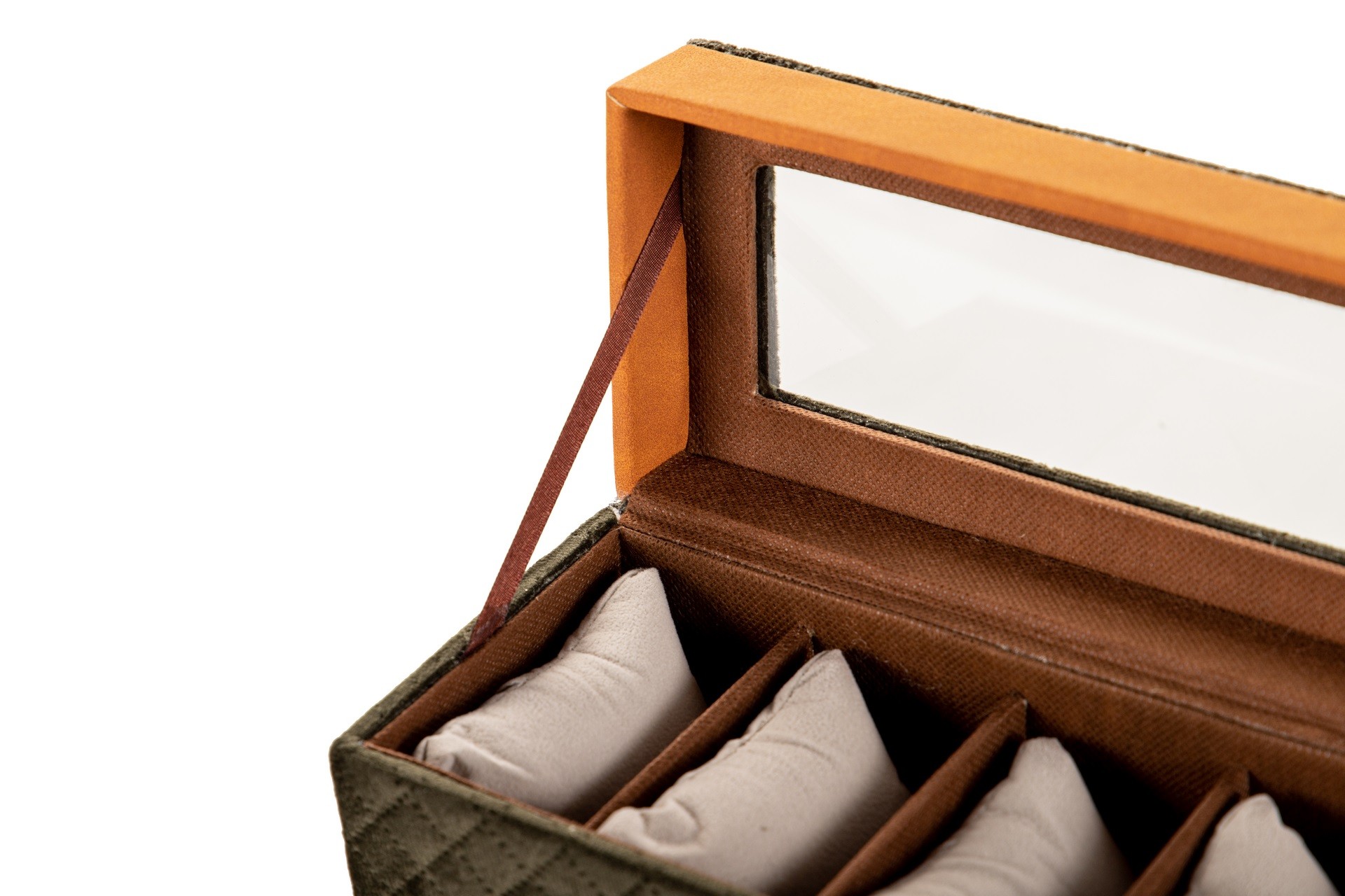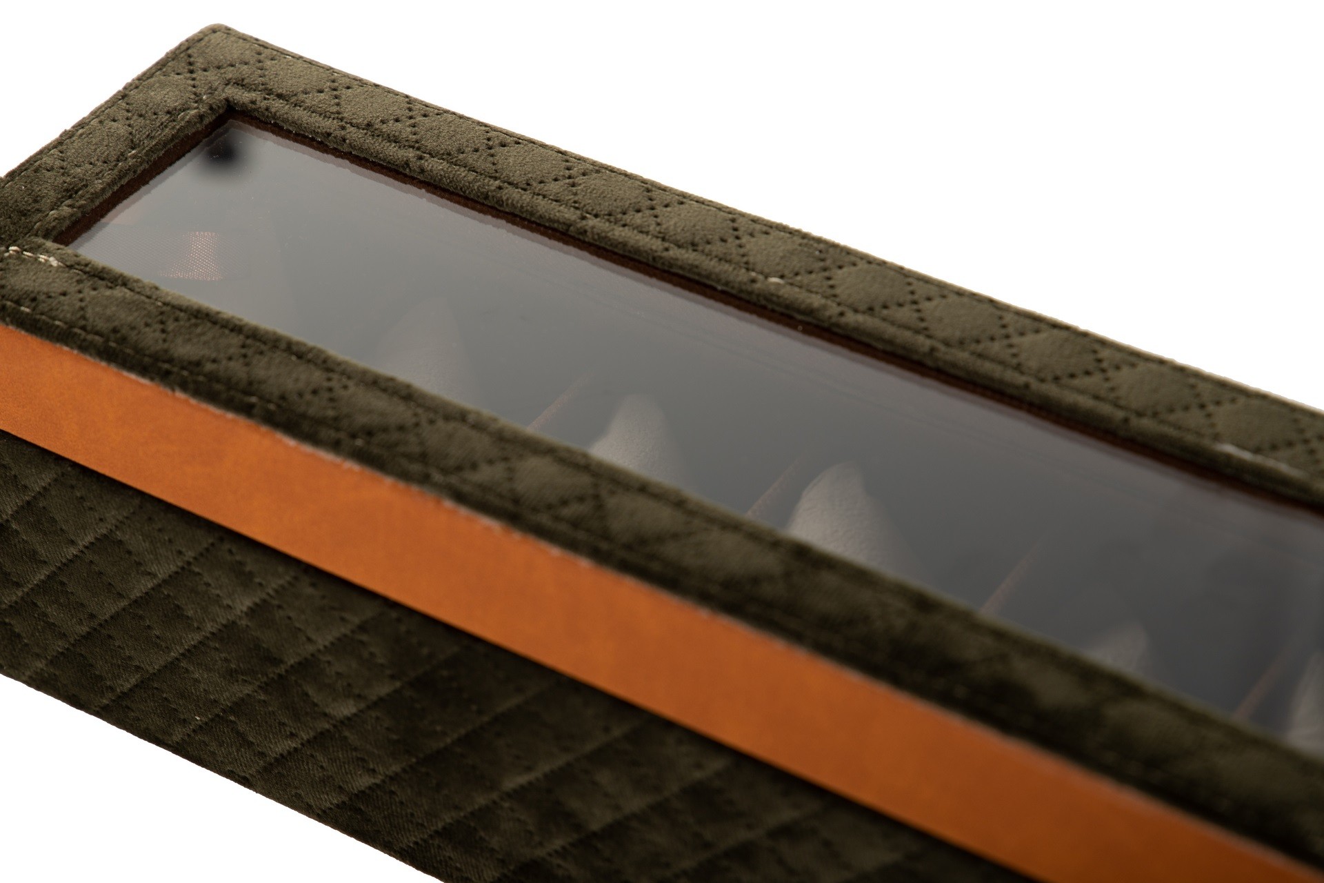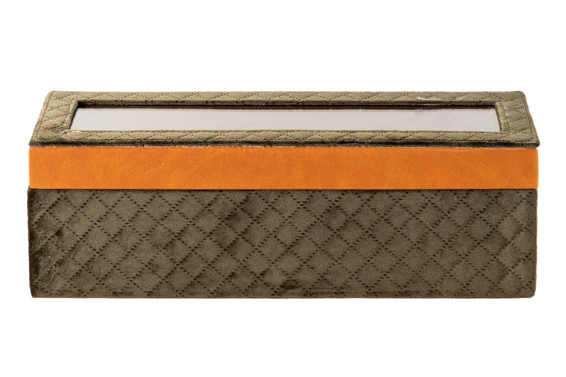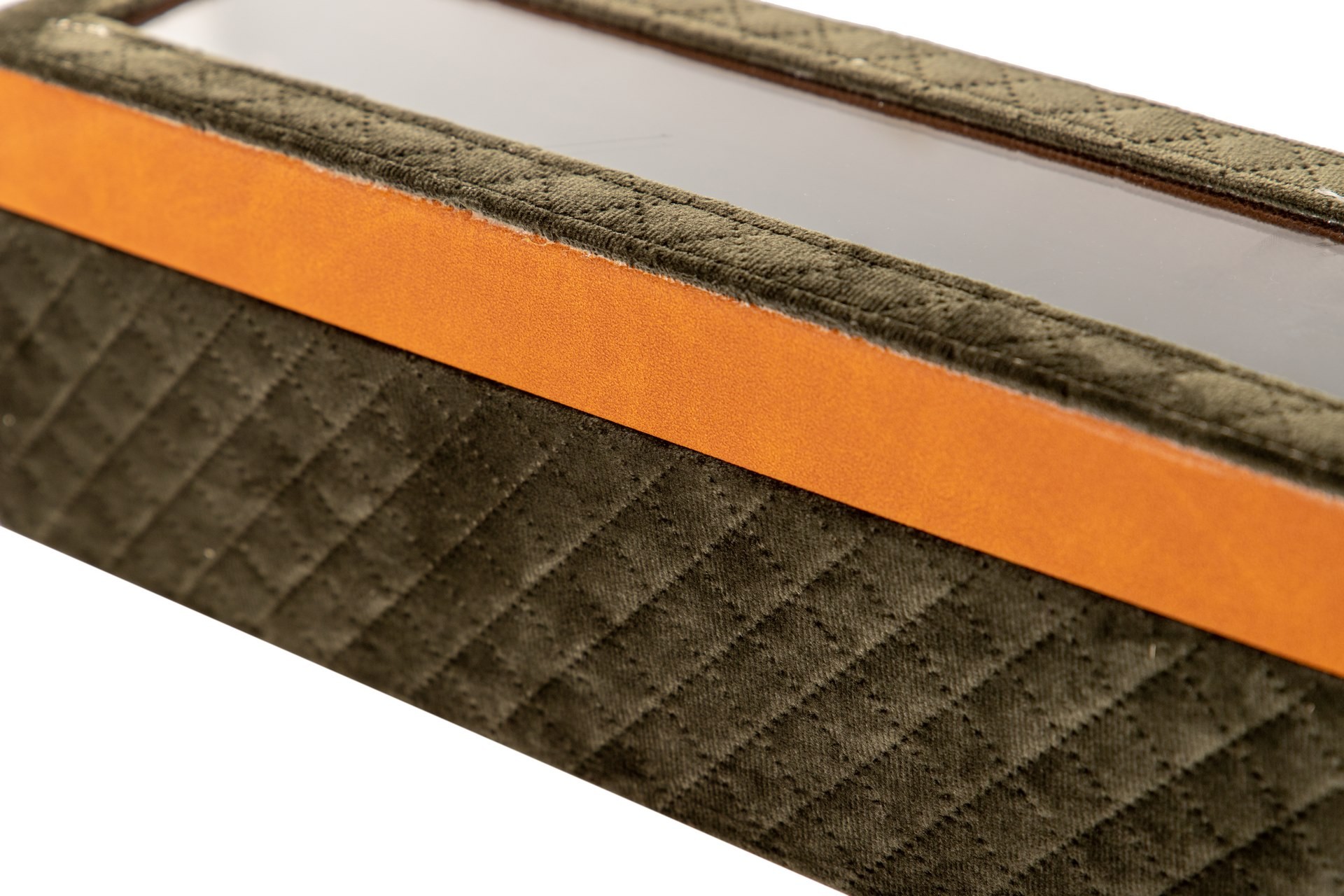 Em veludo e com vidro em cima.
