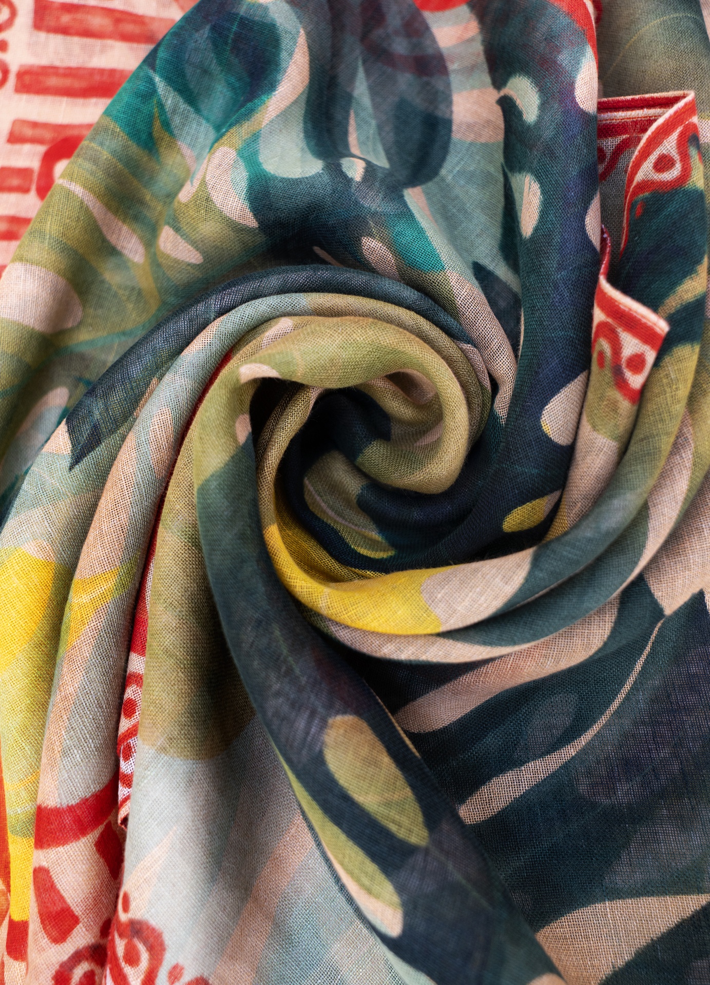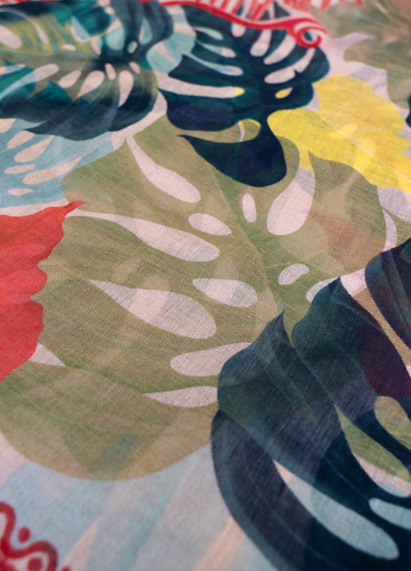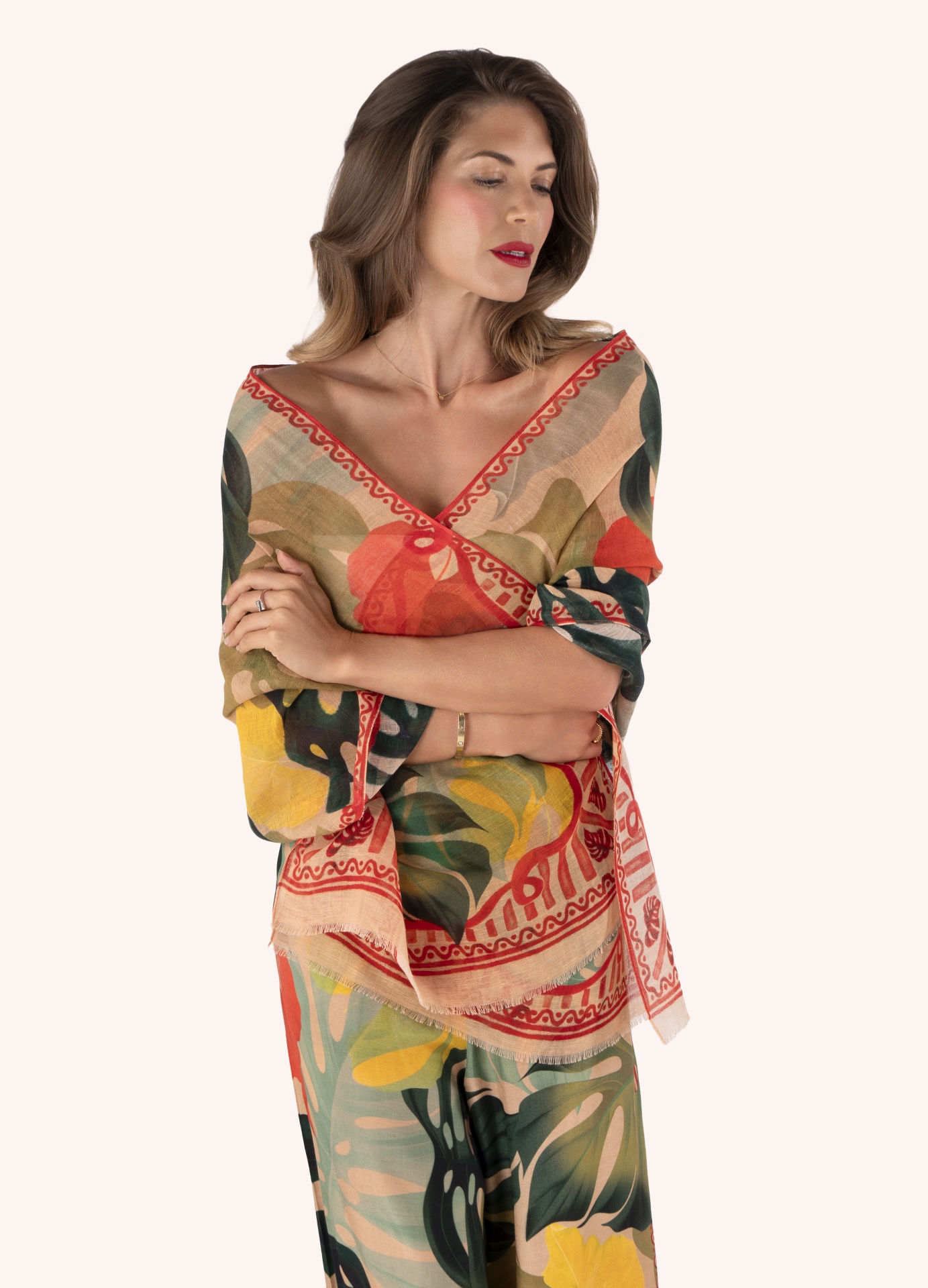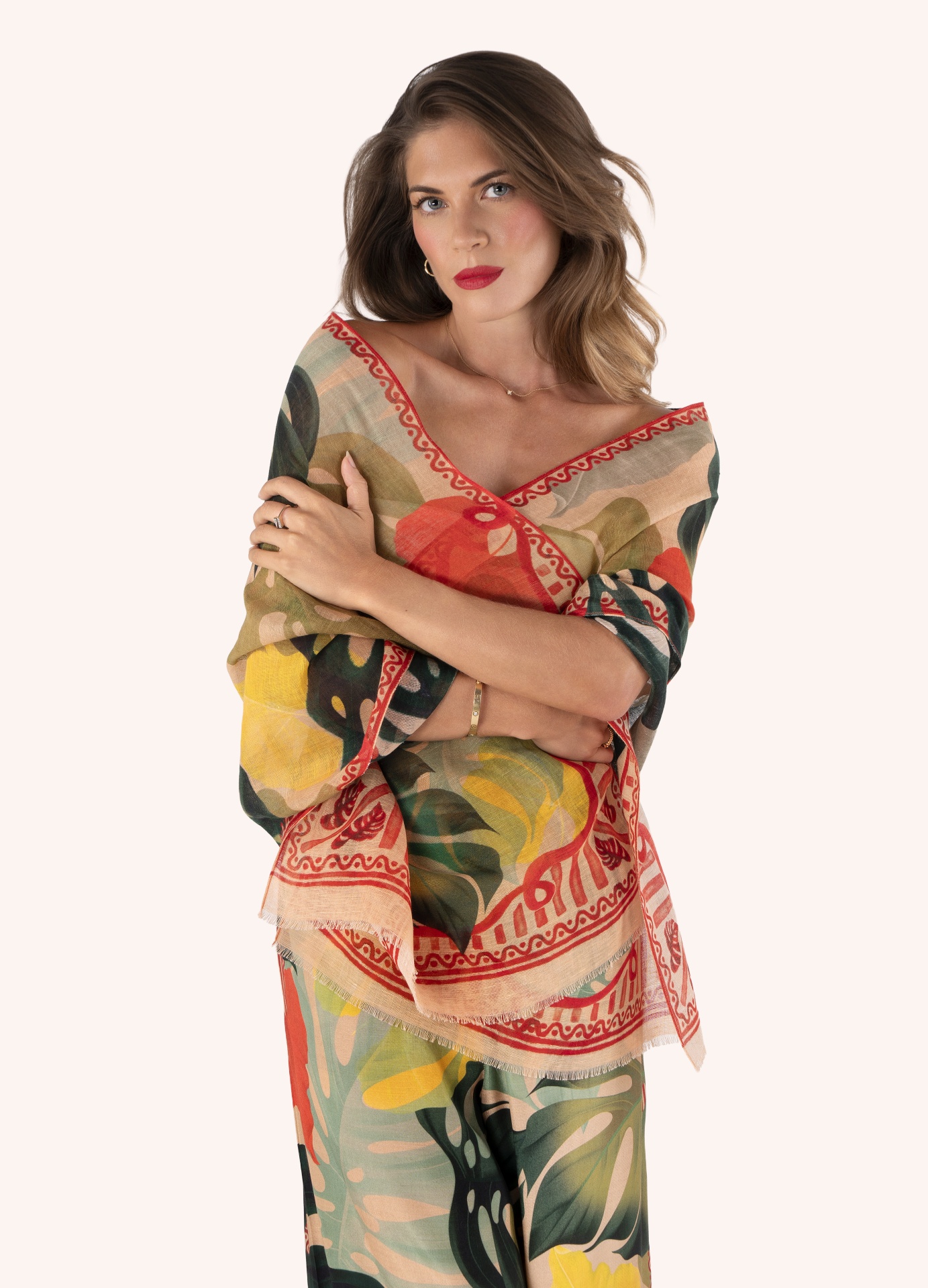 O nosso lenço Exotic Leaves, em linho e algodão, apresenta folhas marcantes com tons vibrantes entrelaçados. Ensolarado e parcialmente sombreado, este lenço inspirado na floresta tropical é perfeito para todos os amantes de arte e de viagens! Ideal tanto para usar a caminho das compras como para dar um toque especial ao seu look de noite, nunca mais vai querer tirá-lo. Presenteie-se!