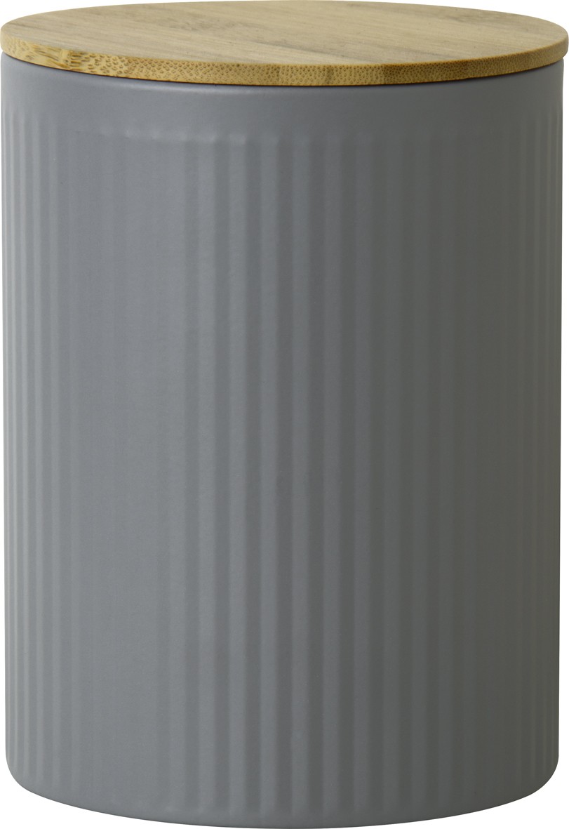 Recipiente cilíndrico cinzento com tampa em madeira clara