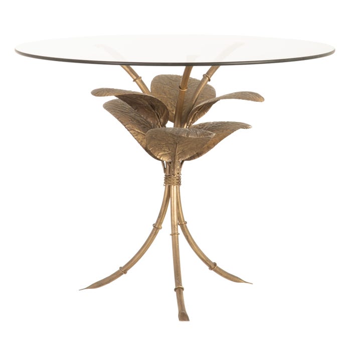Mesa auxiliar com estrutura em metal dourado e tampo em vidro.