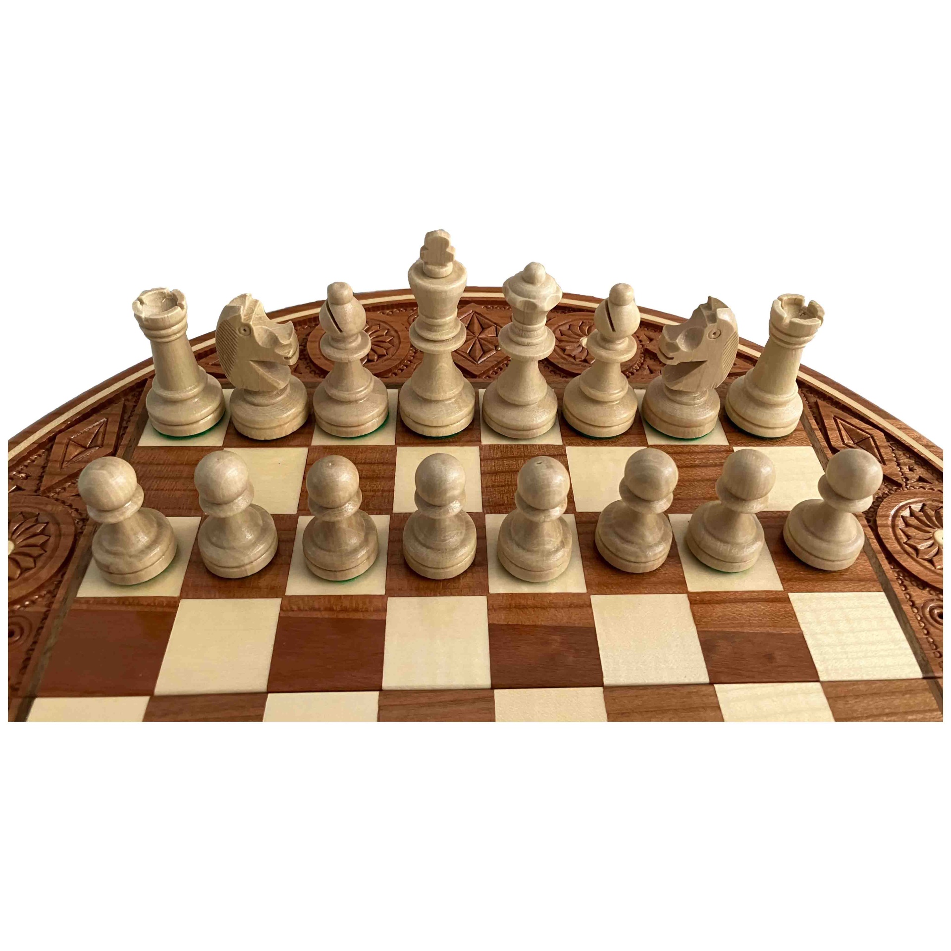Tabuleiro de xadrez redondo esculpido com figuras, em madeira, jogo de xadrez 35x35 cm