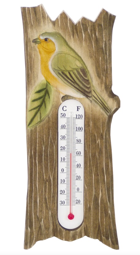 Termômetro de madeira esculpido e pintado à mão. O termômetro mede 24 x 8 cm e está disponível com diversos motivos de animais.