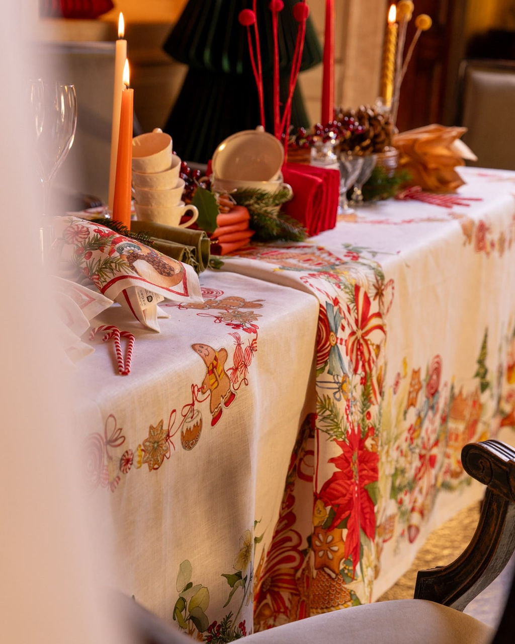 . A toalha de mesa de Natal MarzaPEPE é estampada em linho fino e é ideal para receber convidados com estilo e se deixar levar pela beleza da natureza.