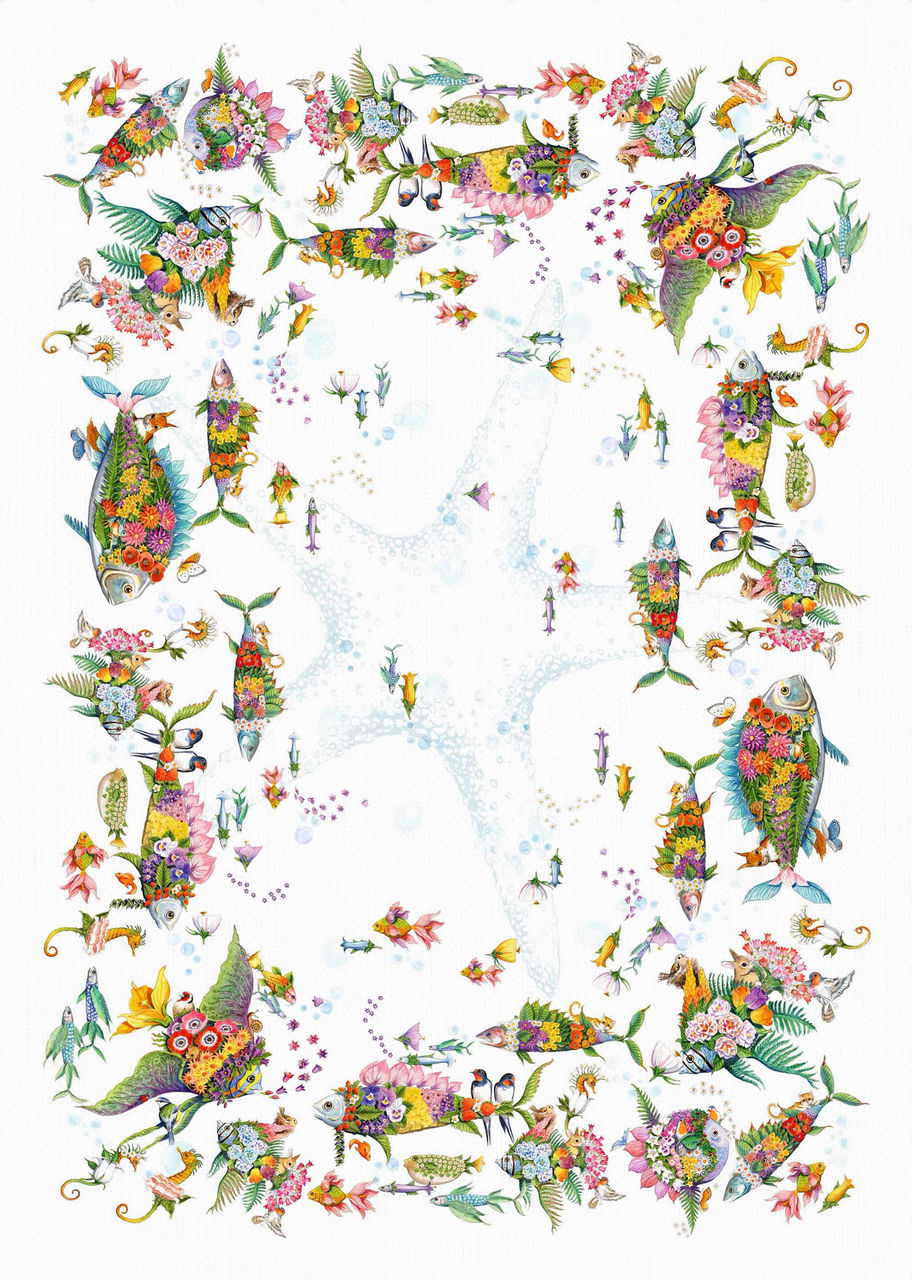 Decore a sua mesa com a toalha PESCIFLORA, onde flores e peixes dançam no meio de uma explosão de cores. O estampado vibrante evoca a elegância de um jardim subaquático, criando um ambiente fresco e relaxante que evoca os dias de praia e as brisas de verão. Esta toalha de mesa colorida revela um mundo de fantasia de profundezas marinhas entrelaçadas com bouquets floridos.