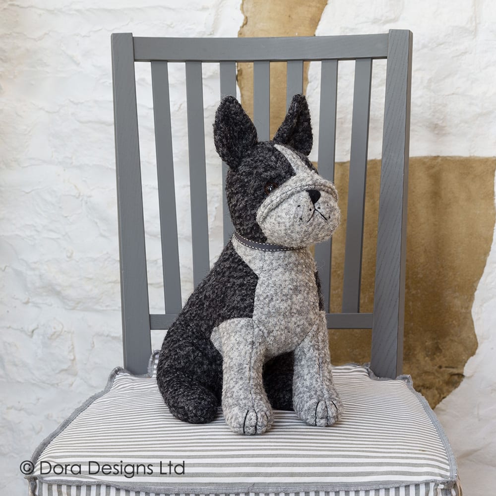 Com acabamento em tecido boucle macio com uma textura adorável em tons de cinza claro e escuro, este filhote senta-se docemente à sua porta para segurá-la aberta para você.