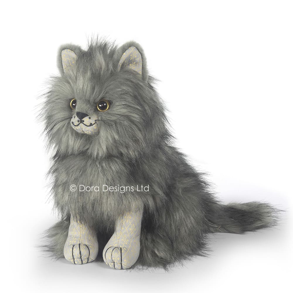 Suas patas são delicadamente bordadas e feitas de um tecido de brocado cinza com um padrão trançado em fios de cor limão, assim como suas orelhas e focinho. Ela tem um lindo nariz bordado e um sorriso com bigodes de cordão revestidos e flexíveis.