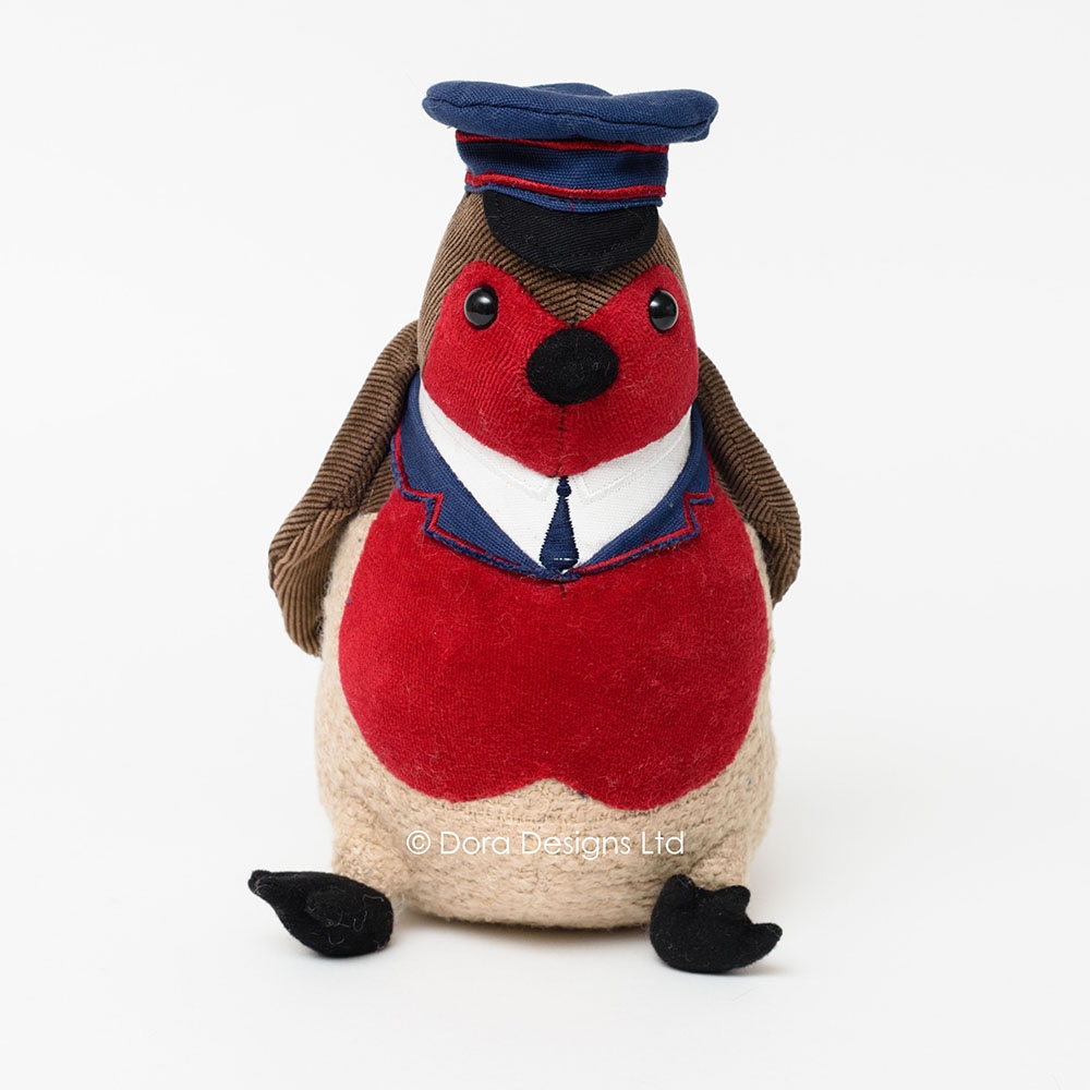 O bonito Padraig the Robin é acabado em tecido de veludo marrom com detalhes em tecido vermelho. Completo com chapéu postal