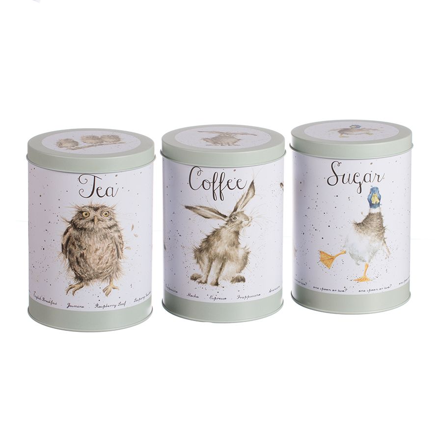 Wrendale Designs Conjunto de 3 latas redondas para armazenamento de chá, café e açucar - Lebre, Coruja e Pato.